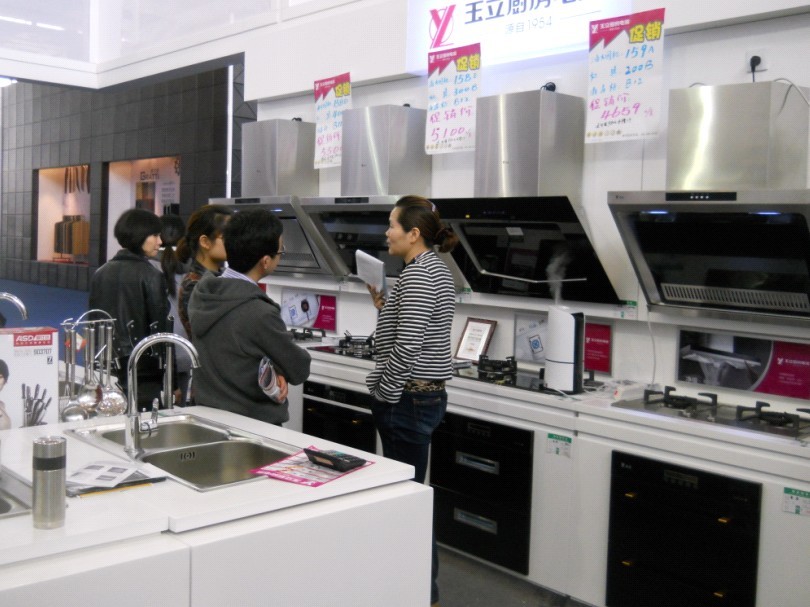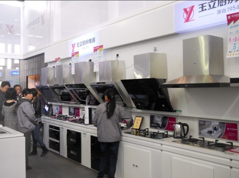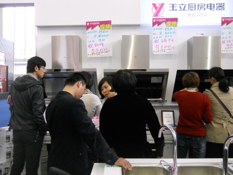 (體驗(yàn)玉立常規(guī)廚電的顧客們并商量著下訂單)