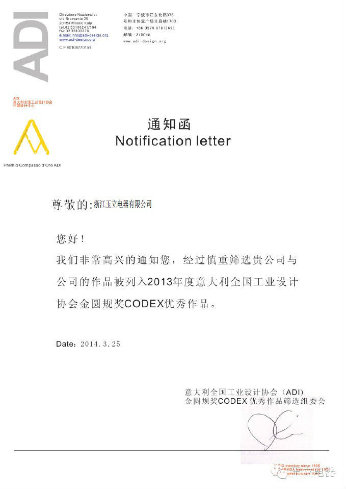 不無巧合,玉立創始于1954年與ADI金圓規獎項1954創立同一年而生,玉立電器正是憑借60年的歷史和精湛的工業制造技術榮獲意大利全國工業設計協會金圓規獎CODEX優秀作品大獎。